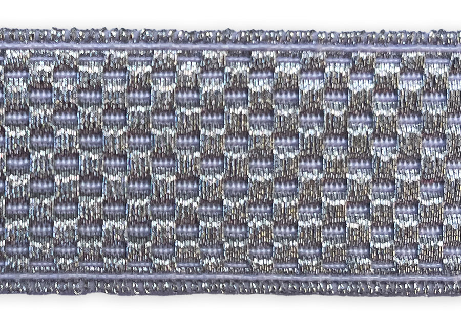 1" wide flat trim in metallic silver and with a checked textured. This trim is perfect for sewing haute couture garments such as French designer-inspired jackets - layer your trims for a unique and special look! Made in Germany.