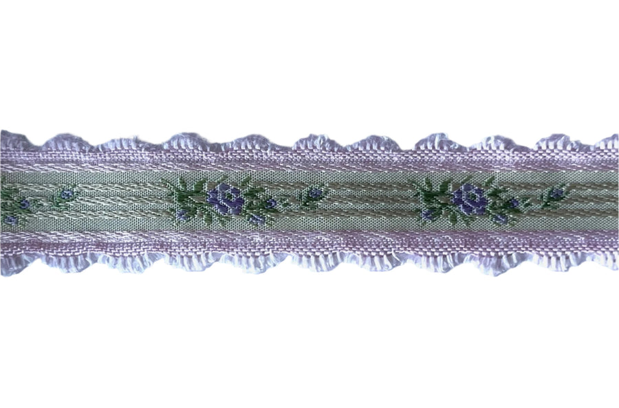 1" pale pink woven ribbon with row of violet roses running down the center on a striped cream background and with picot edges. Made in France.