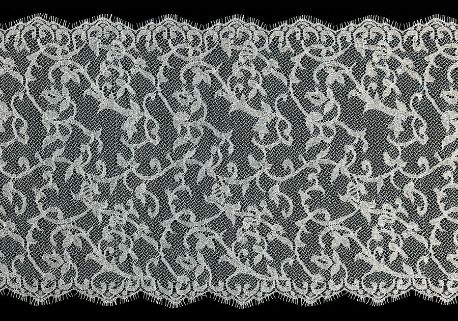 12" wide metallic bright silver Chantilly lace; this is a sophisticated galloon lace with a graceful pattern of intertwined vines, eyelash edging, and shallow scalloped borders. Made in France.