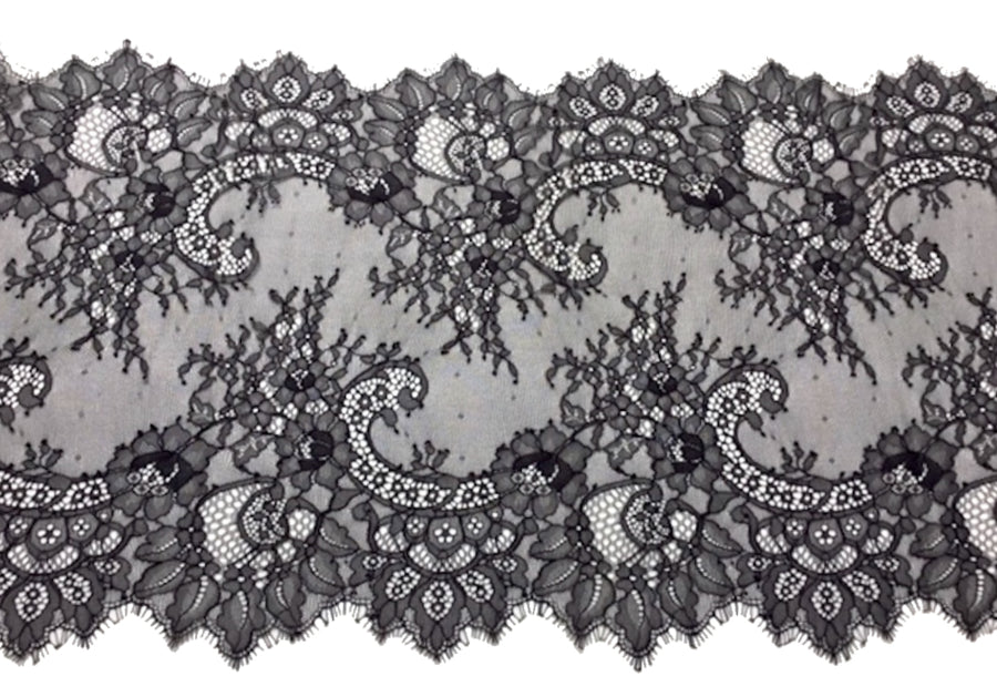 13" wide black Chantilly lace; this is galloon lace with a graceful floral pattern, fine background netting eyelash edges, and scalloped borders. This charming lace may be cut along the center to make borders or trim.