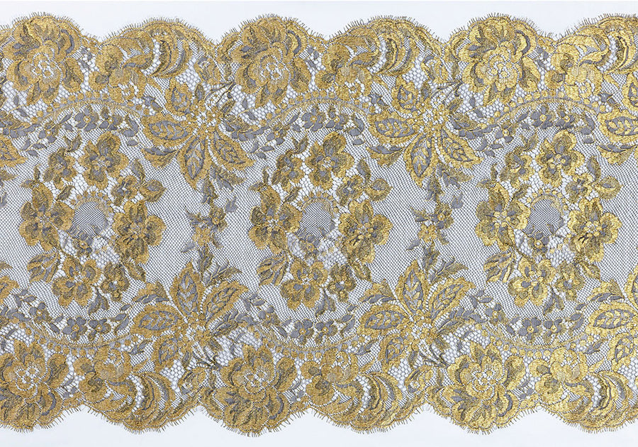 14"/35.5 cm wide Chantilly lace consisting of a metallic antique gold pattern on black Chantilly; this is an ultra elegant, classic galloon lace with a graceful floral pattern, fine background black netting, eyelash edging, center 6" oval medallions, and scalloped borders. 45% rayon, 30% lurex, and 25% nylon. Made in France.