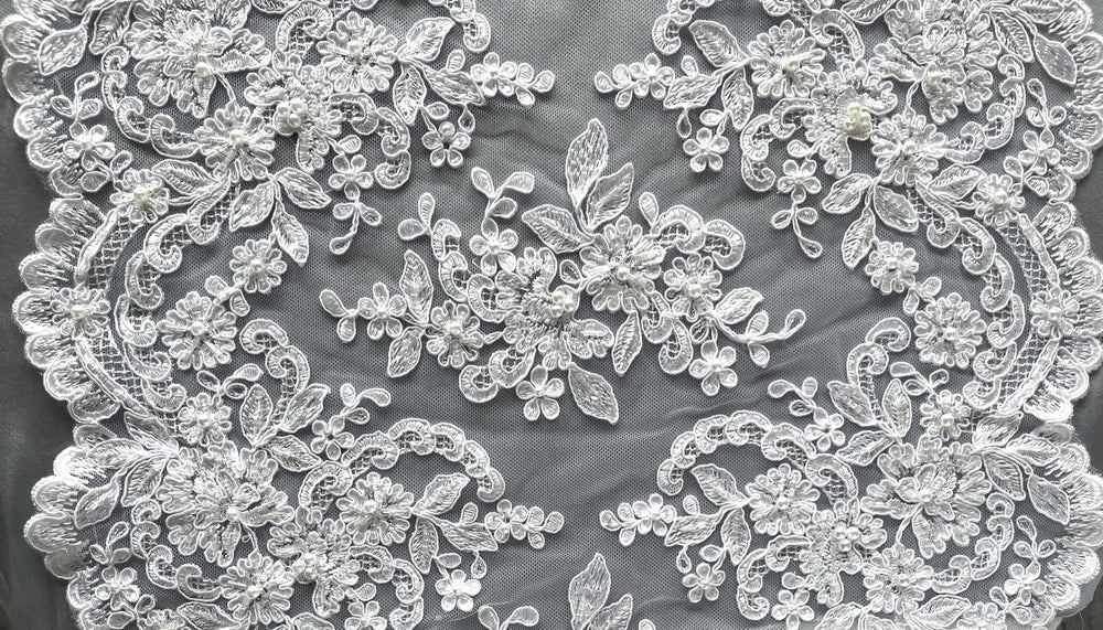 15.5"/39 cm wide bright white beaded and pearled galloon Alençon style lace trim with scallops on both edges, making it easy to cut it in the middle for edging. Scallops are 6.5” and the center appliqués are 6" high.