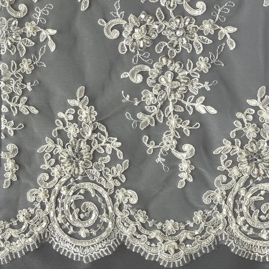 15"/37 cm wide light ivory beaded, sequined, and pearled galloon Alençon style lace trim with scallops on both edges, making it easy to cut it in the middle for edging. The center appliqués are 10" high.