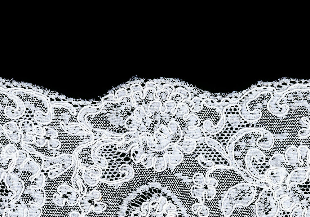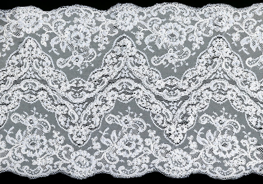 16" wide cream Alençon lace; this is a galloon lace with a graceful floral pattern. This beautiful and romantic lace may be easily cut along along the sides leaving three lengths to make borders and trim for bridal attire and veils. Made in France