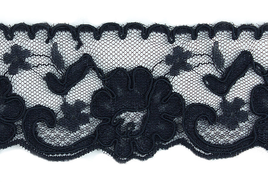 2 1/4" wide black Alençon lace trim with a graceful floral pattern and scalloped border on netting.