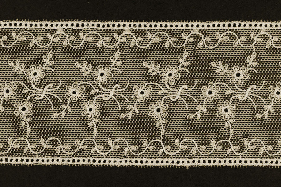 2 1/4" wide ivory embroidered netting lace with a graceful floral pattern, fine background netting, and delicate faggotting along each edge.