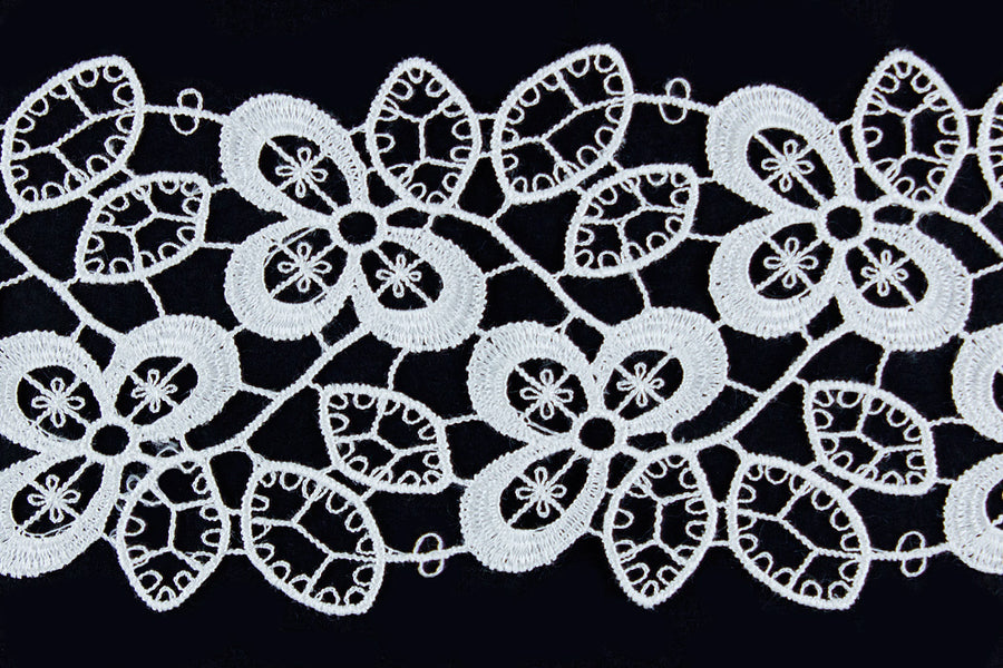 2 1/4" wide white Venise lace in a floral and leaf pattern.