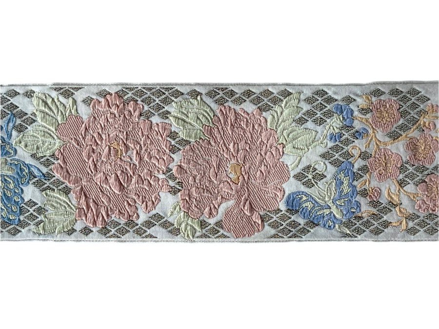 2 3/4" cream-colored woven ribbon embroidered with effervescent ballet pink roses, deep sky blue butterflies and accented with metallic peach diamond shapes. Made in France.