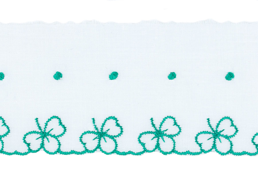 2 3/8" wide white edging eyelet trim with a green clover border. Cotton and polyester blend.