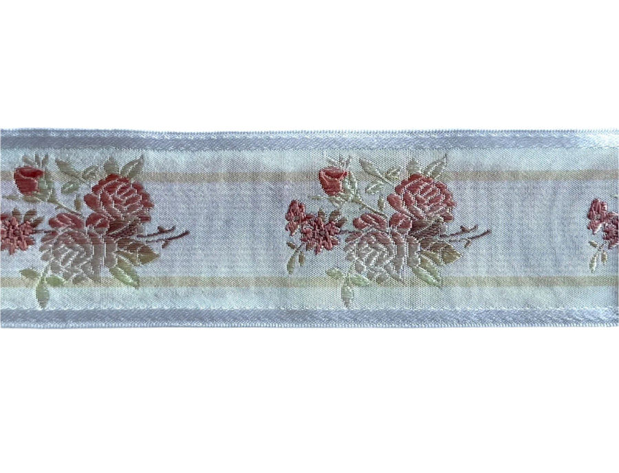 2" striped woven ribbon embroidered with ombré ballet pink roses with sage green leaves and narrow satin edges. Made in France.