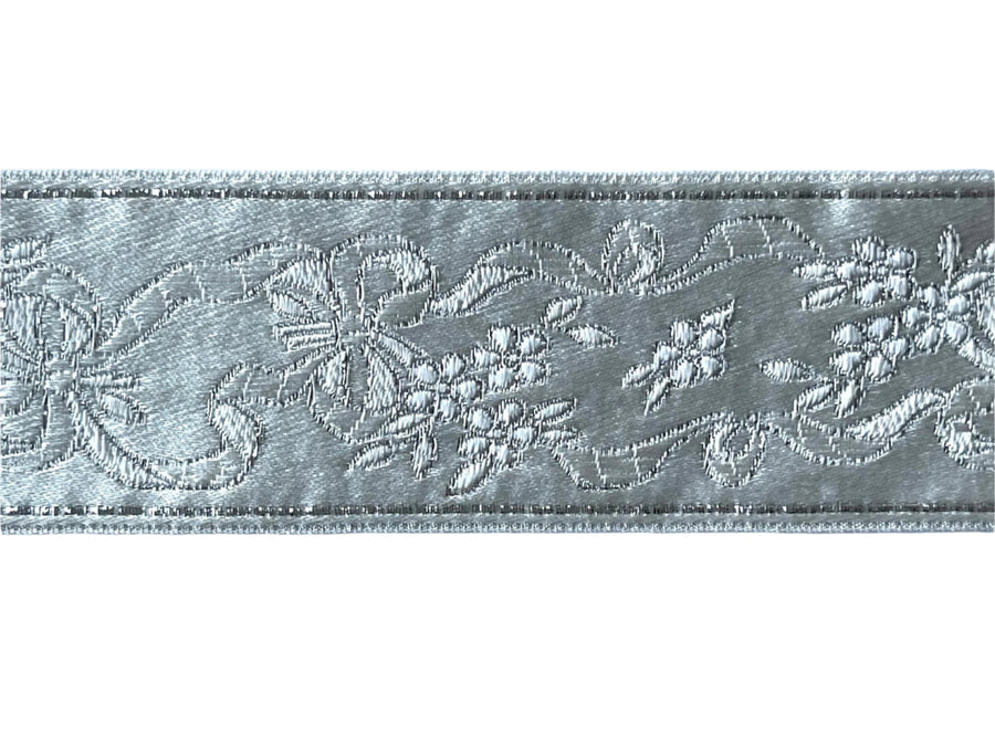 2" white and metallic silver brocade ribbon in a graceful scrolling ribbon and floral design. Made in France.