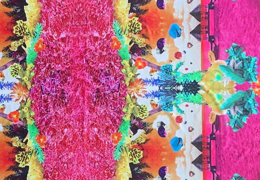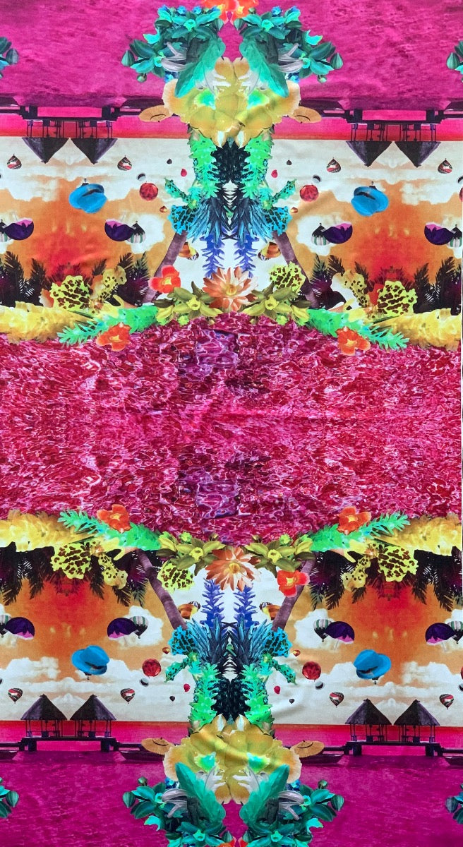 A polyester swimsuit jersey, in a print of a surreal-inspired tropical landscape in shades of fuchsia, sea foam green, orange, teal blue, and lime - with it's touch of lycra, this is perfect for a show-stopping swimsuit or top. Made in Italy. 90% polyamide and 10% lycra blend. Sold by the panel, and each panel is 29" by 57" wide. No swatches.