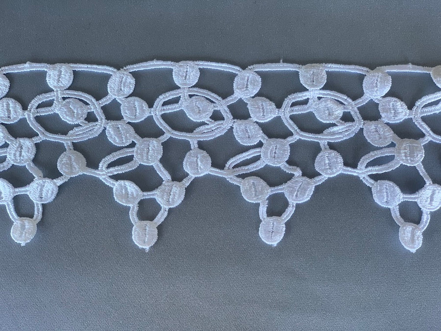 3 1/2”/9 cm wide white Venise edging lace in a geometric, Art Nouveau-influenced design. 100% rayon.
