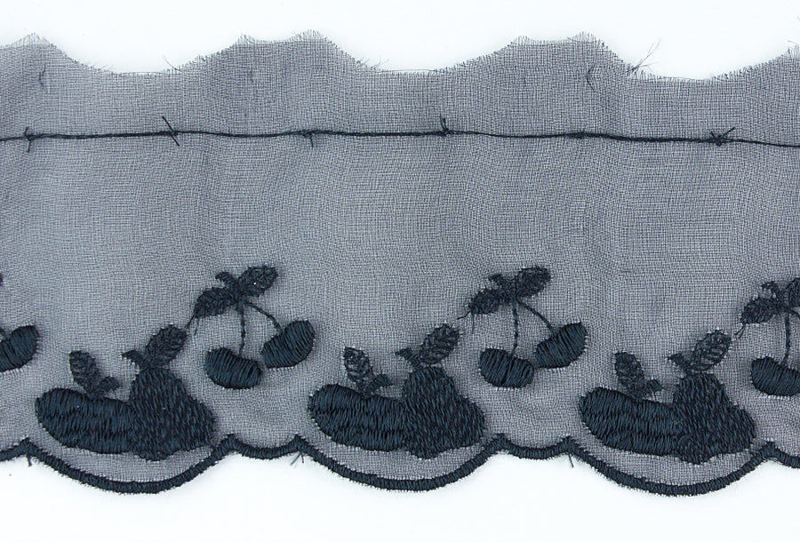 3" wide black sheer silk organza with an embroidered black fruit motif along it's scalloped edge.
