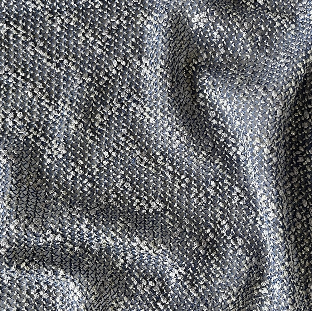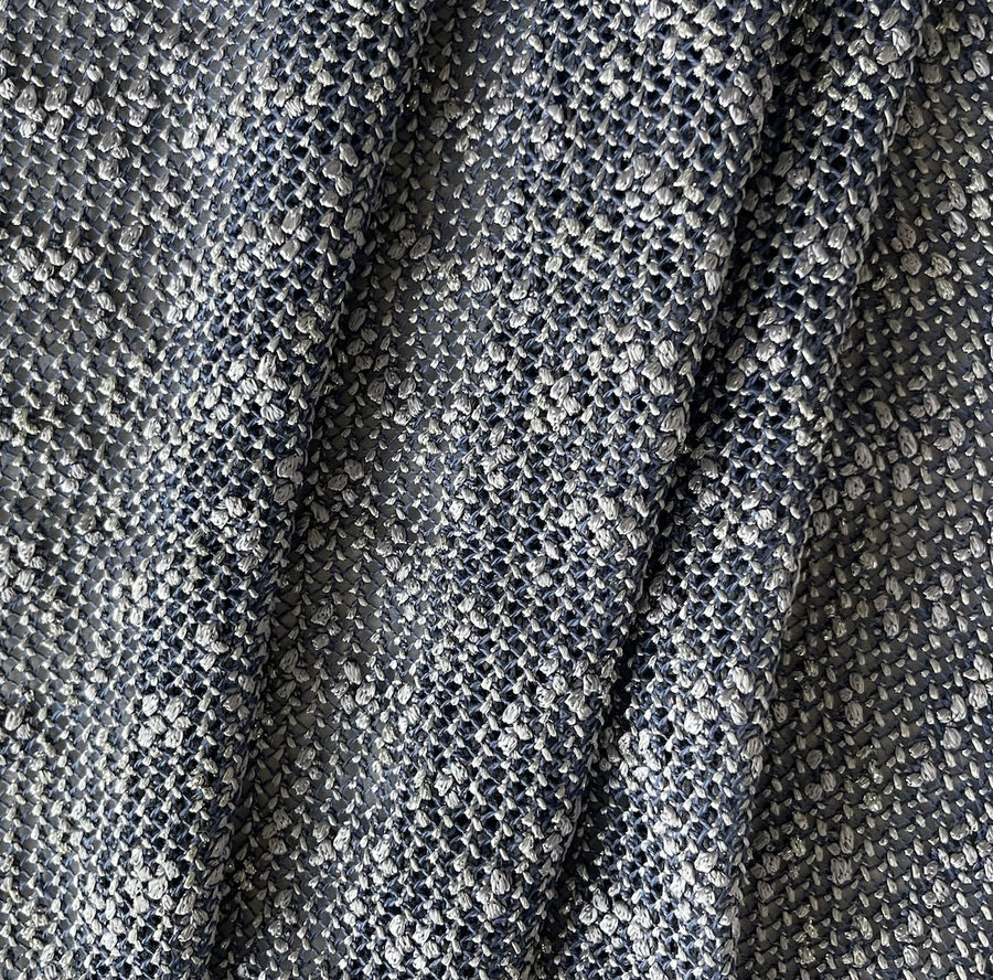 An open-weave, semi-sheer cotton blend sweater knit in shades of silvery grey with a subtle lavender cast - this elegant soft sweater knit is great for tops or tunics. 70% cotton and 30% acrylic. 56" wide.