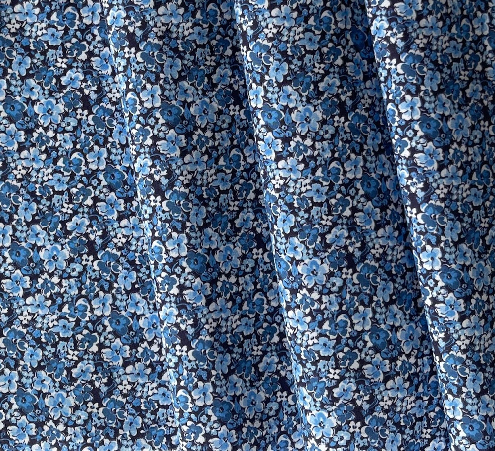 An airy cotton lawn in a print of forget-me-nots in calm shades of blue - this soft, lightweight print is perfect for blouses, sundresses, and shirts. Made in Italy. 100% cotton. 59" wide.