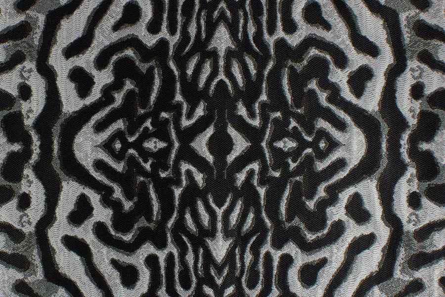 A midweight silk blend flat-finished brocade. This stunning brocade has a large scale striped abstract design in shades of silvery grey and black - stripes range in width from 3" to 10". Full-bodied and reversible, this would make an elegant evening cape, or even a dramatic shower curtain for a Carrara marbled bathroom. Made in Italy. 65% Polyester, 30% silk, and 5% polyamide. 53".