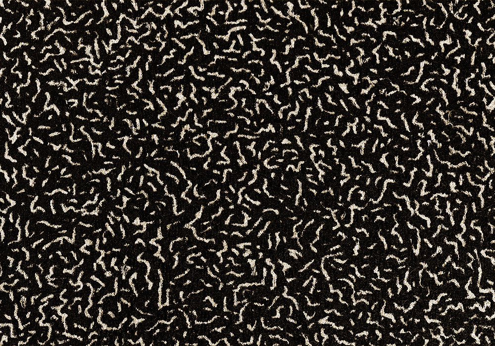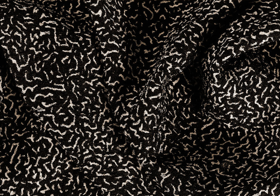 An elegant black silk bouclé with an off-white squiggled abstract design - perfect for a gown or an elegant evening blazer. Made in Italy. 30% silk and 70% poliamide blend. 48" wide.