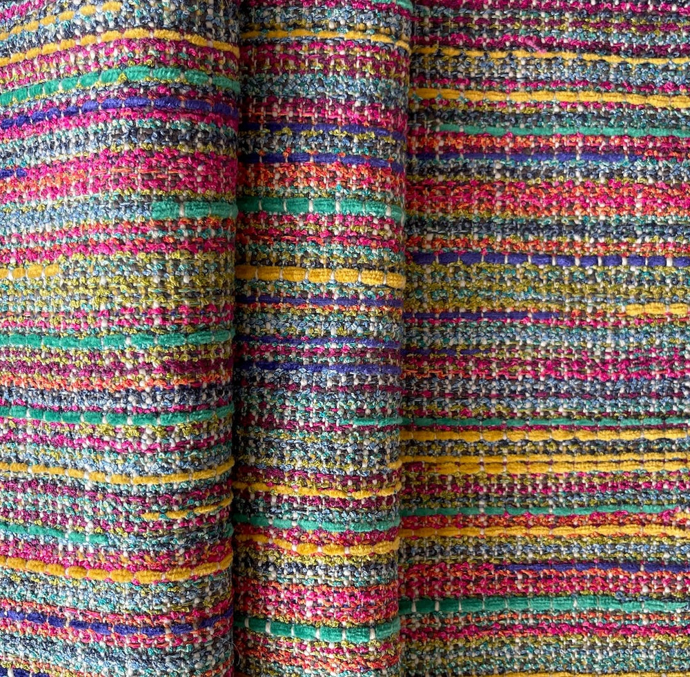 A mid-weight rayon blend upholstery fabric in a joyful stripe in shades of bight mustard, hot pink, purple, mint green, and vermilion - this sturdy, textured upholstery fabric is perfect for sofas, chairs, ottomans and headboards. Made in Turkey. Polyester, rayon viscose, and cotton. 54" wide.