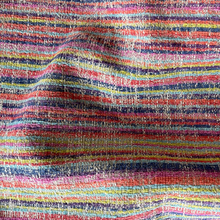 A mid-weight polyester rayon blend upholstery fabric in a modern distressed stripe in shades of sky blue, rose, purple, citrine, tangerine, and indigo - this sturdy, textured upholstery fabric is perfect for sofas, chairs, ottomans and headboards. Made in Turkey. 40% polyester, 26% rayon viscose, 24% cotton, and 10% linen. 57" wide.