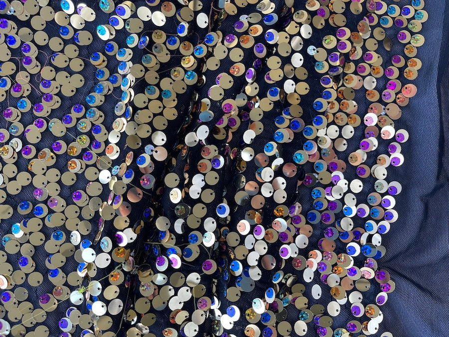 A glitzy stretch mesh scattered with larger gold sequins, with a selection of gold sequins topped with sparkling smaller fuchsia and turquoise sequins, all on a black stretch mesh base. This stretch dressy fabric swishes as you move - perfect for a long skirt, a dress, costumes, or a tunic. Sequins on a polyester/lycra mesh base. 62" wide.