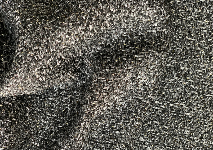 A metallic cotton blend bouclé suiting in chic, understated pewter and silver tweed with gold flecks - loosely woven, this bouclé requires interfacing to add body and is perfect for pants, dresses, or suits. Made in Italy. 60% polyester, 30% cotton, and 10% acrylic blend. 61" Wide.