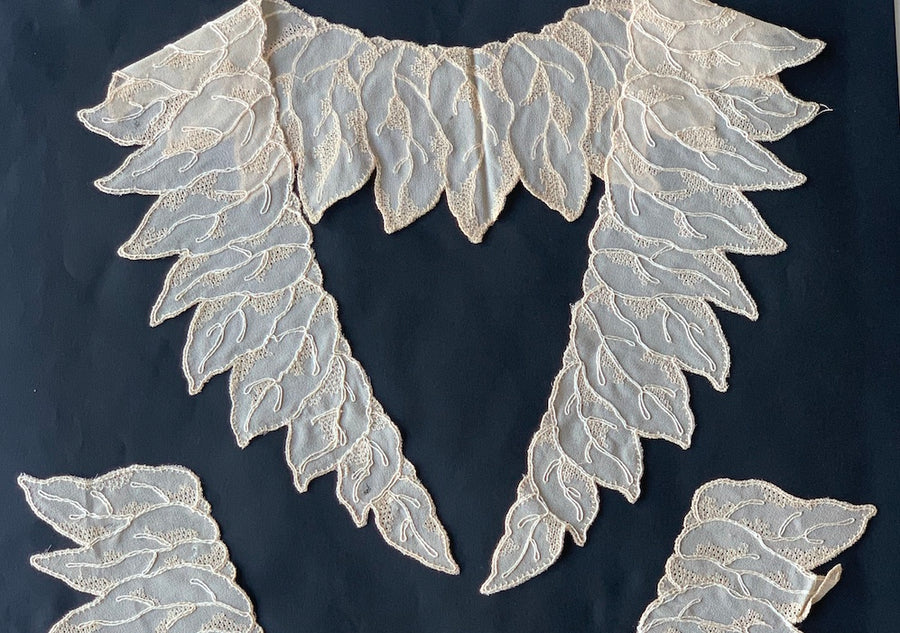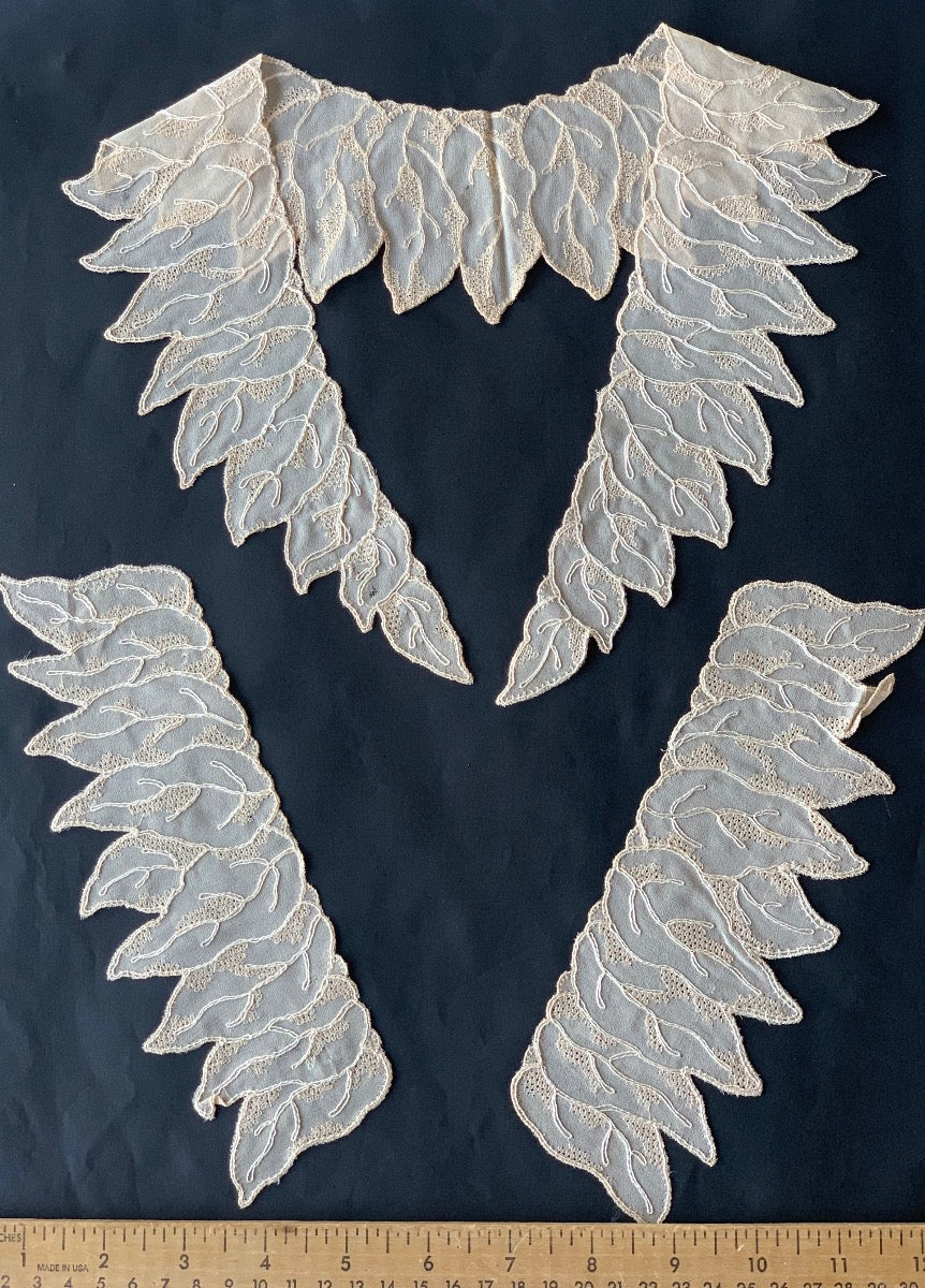 Vintage three-piece embroidered silk set; one embroidered lace collar plus two sleeve cuffs, all with a delicate embroidered leaf design. Lace collars add a powerful, feminine accent to sweaters, dresses, and blouses. The collar is 11” wide x 9” long x 2-3" wide, and the cuffs are is 3“ wide x 8” long. Silk.