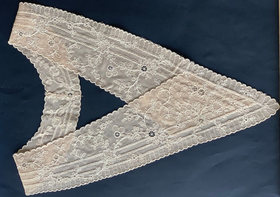 Vintage embroidered lace collar in beige, with a fine floral design. Lace collars add a powerful, feminine accent to sweaters, dresses, and blouses. 9” across x 13” long x 3" wide. Made in France. 100% cotton.