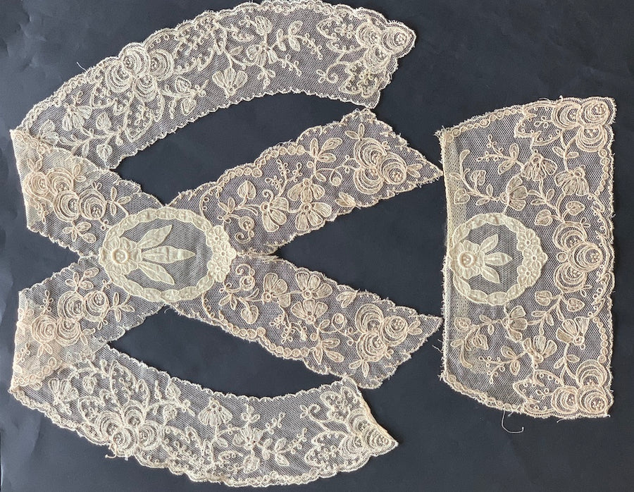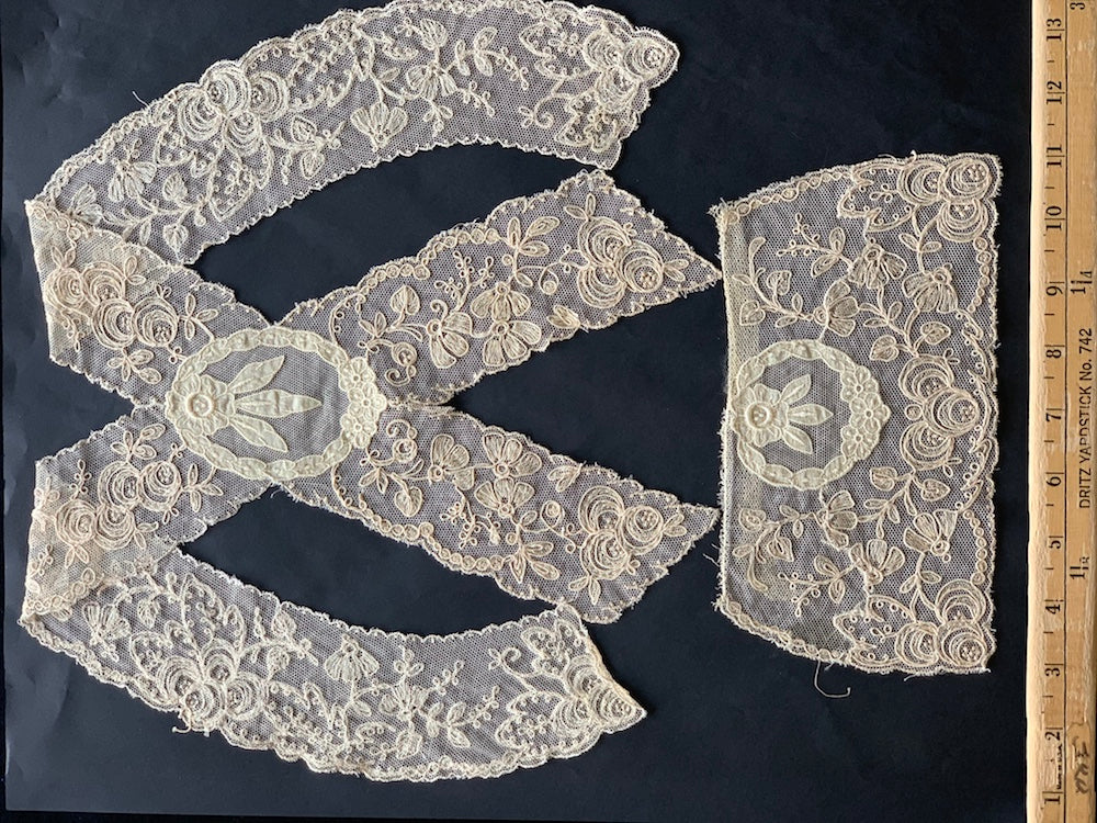 Vintage two-piece set; embroidered lace collar plus an insert in beige, with a delicate embroidered and appliquéd floral design. Lace collars add a powerful, feminine accent to sweaters, dresses, and blouses. The collar is 9” across x 13” long x 3" wide, and the inset is 7.5" wide x 4" long. Made in France. 100% cotton.