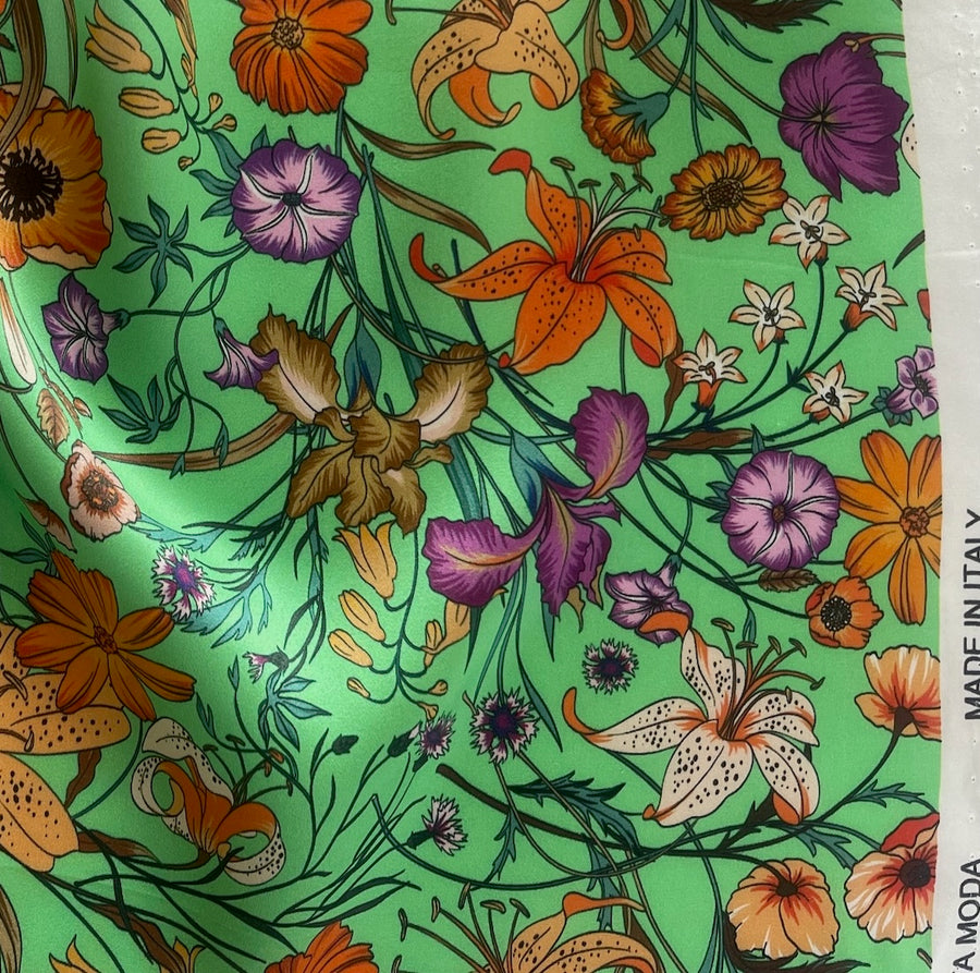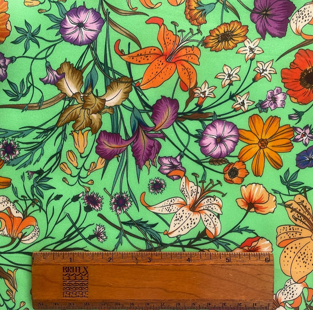 A brilliant silk satin charmeuse in a print of scattered tiger lilies, irises,and  morning glories on a spearmint green background -  this gorgeous, airy silk charmeuse is perfect for a wrap-front blouse, a chic kimono, silky lounge-wear, swimwear cover-up, or a summer dress. Made in Italy. 100% silk. 54" wide.