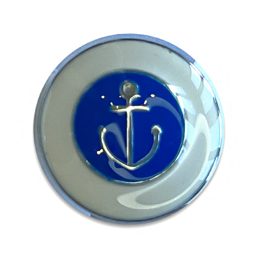 A navy, white, and silver blazer button with a silver anchor on a bright navy and white background and a thin silver rim. Shank backing. Made in Italy.