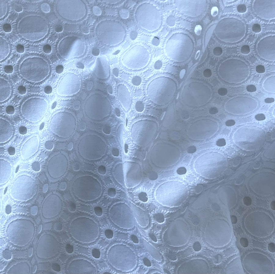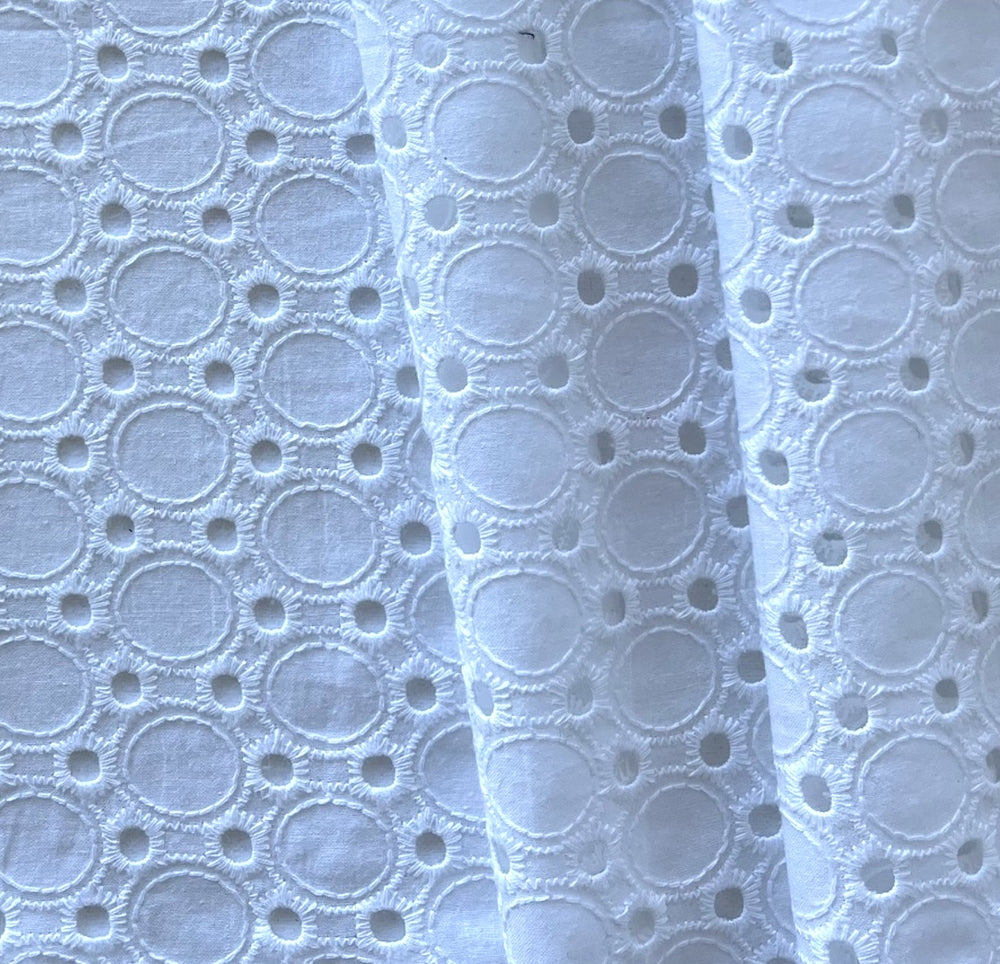 A lighter weight embroidered cotton eyelet in white with smaller round eyelets circling a larger eyelet and 3" plain borders along each selvedge - this striking fabric is great for a flirty full skirt, a tiered sundress, or summer shorts. Made in Italy. 100% cotton. 57" wide.