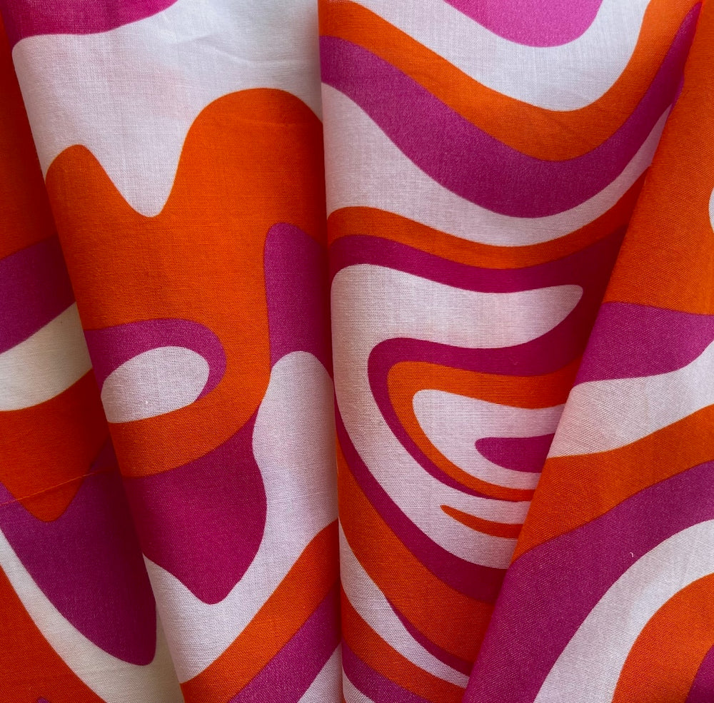An airy cotton lawn in a print of Pucci-esque undulating swirls in raspberry, white, and tangerine - this soft, lightweight, tightly woven print is perfect for sundresses, caftans, and shirts. Made in Italy. 100% cotton. 59" wide.