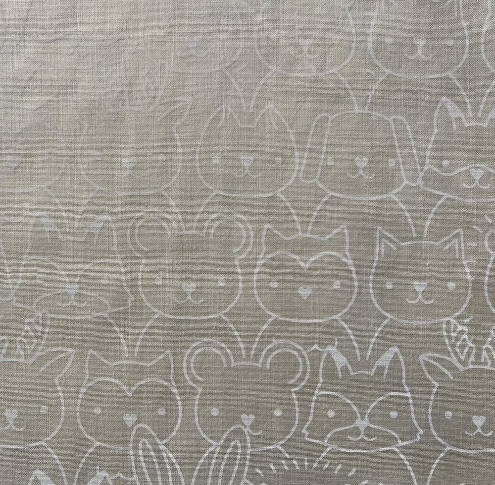A quilting cotton in a print of woodland creatures including owls, bunnies, raccoons, and cats in white on a natural background - this print is perfect for gift wrapping, full skirts, blouses, totes, napkins, or aprons. Made in Japan. 100% cotton. 45" wide.