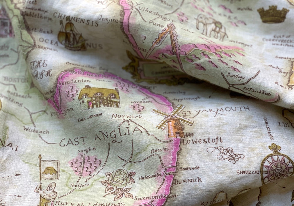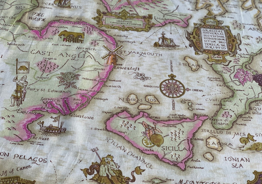 A slightly textured English linen blend in an antique map print, festooned with whimsical castles, knights, ships, architecture, and crests, and in shades of rose, wheat, natural, and sage - perfect for Roman shades, slip covers, and throw pillows. Made in England. 55% linen and 45% viscose. 56" wide.