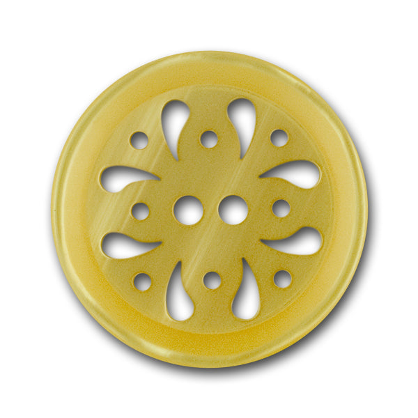 Two-hole soft lemon yellow, cut-out plastic button, with paisley motifs, and a slightly raised rim.