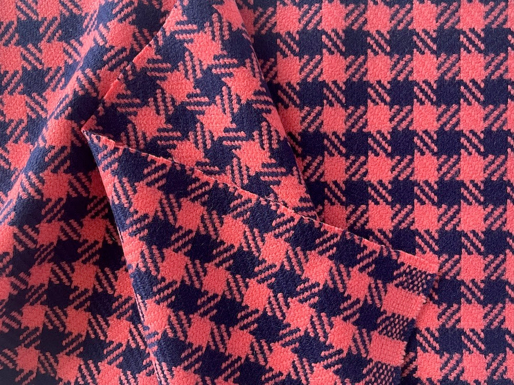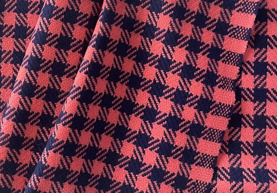 An elegant wool and cashmere blend in a deep coral and navy check - this sophisticated, fine woolen is finished on both side and perfect for spring culottes, skirt, tunics, or an unlined jacket. Made in Italy by Piacenza. 60% wool and 40% cashmere. 60" wide.