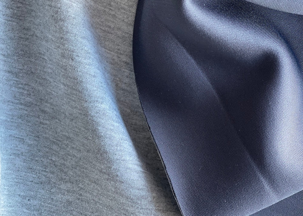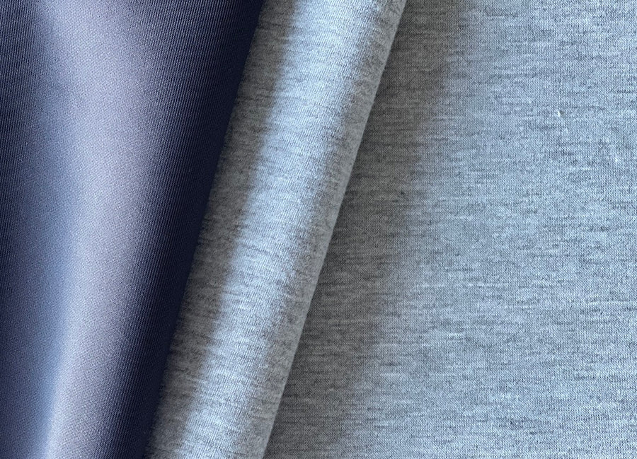A reversible, double-faced polyester blend scuba knit in heathered deep smoke and black - perfect for color-blocking...sew sportswear, a coat, a top, a hooded sweatshirt, or cuffed pants. Used by a high-end designer. 90% polyester and 10% lycra. 59" wide.