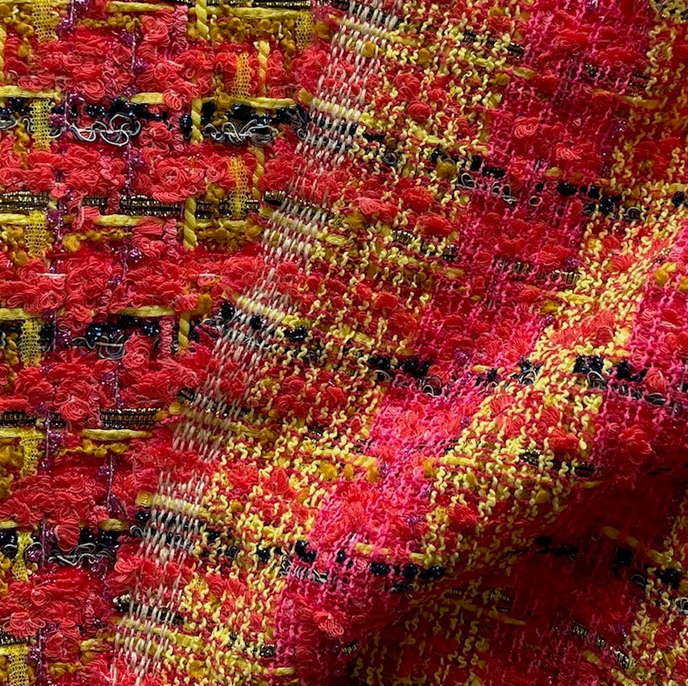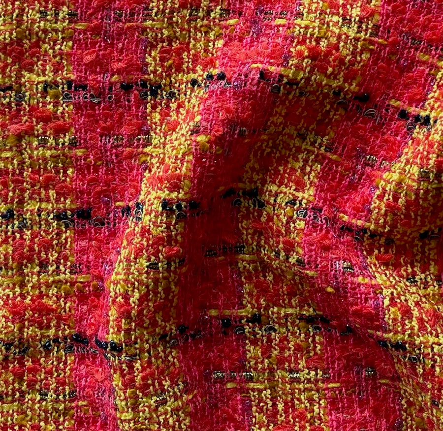 An airy wool blend bouclé in spicy shades of hot pink, canary yellow, and persimmon, accented with cobalt and magenta metallic threads - this fiery gorgeous bouclé is perfect for a French couture-inspired suit, a chic coat, or a dress. Made in Italy. 50% viscose, 20% wool, 20% polyamide, and 10% lurex. 59" wide.