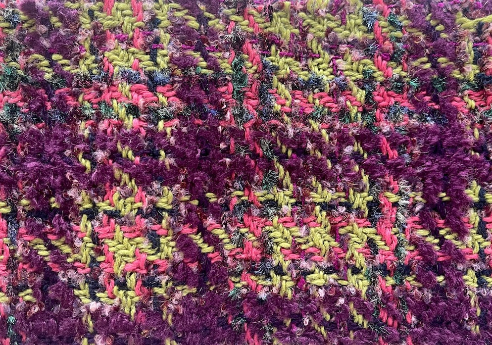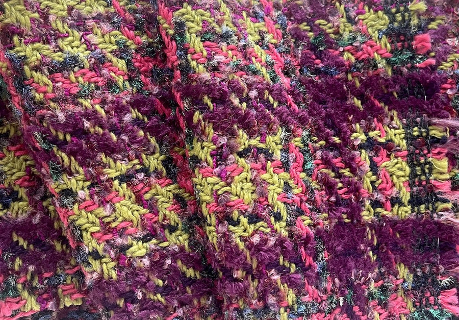 A chic mid-weight woolen blend tweedy bouclé plaid in elegant shades of boysenberry, coral, and absinthe - with multi-textured yarns, this stunning, moderne bouclé is perfect for a grosgrain trimmed Chanel-style jacket, a wrap, or a skirt. Made in Italy. 80% wool, 15% acrylic, and 5% polyester. 60” wide.