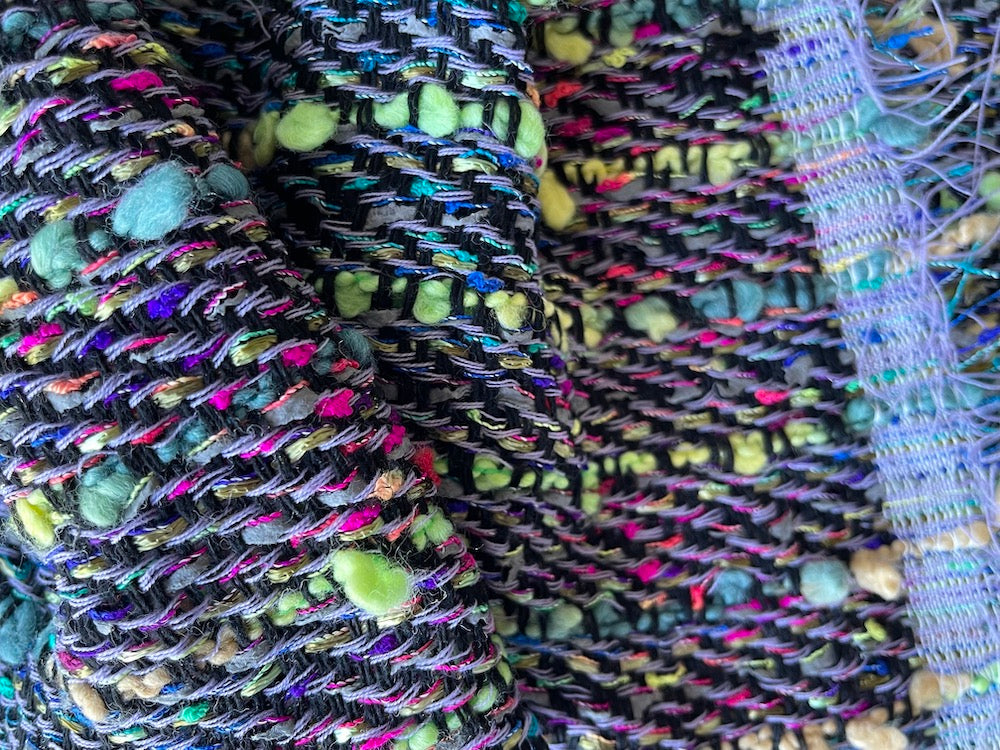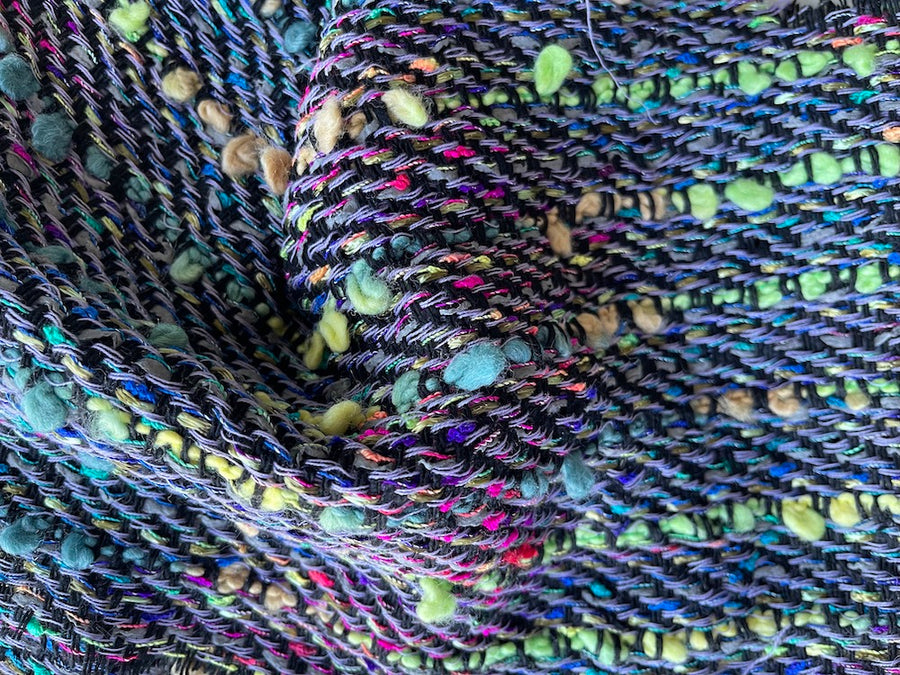 A lighter-weight tweed bouclé in stunning aurora polaris coloration with soft lemon, mint, sky, and cream puffs on a twill background - this unique bouclé is perfect for a French, couture-style jacket, culottes, or sofa throw. Made in Italy. 70% wool, 10% acrylic, and 20% polyester blend. 56" wide. .