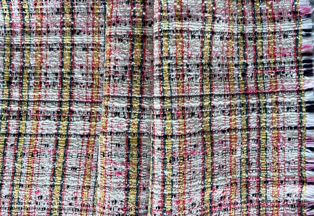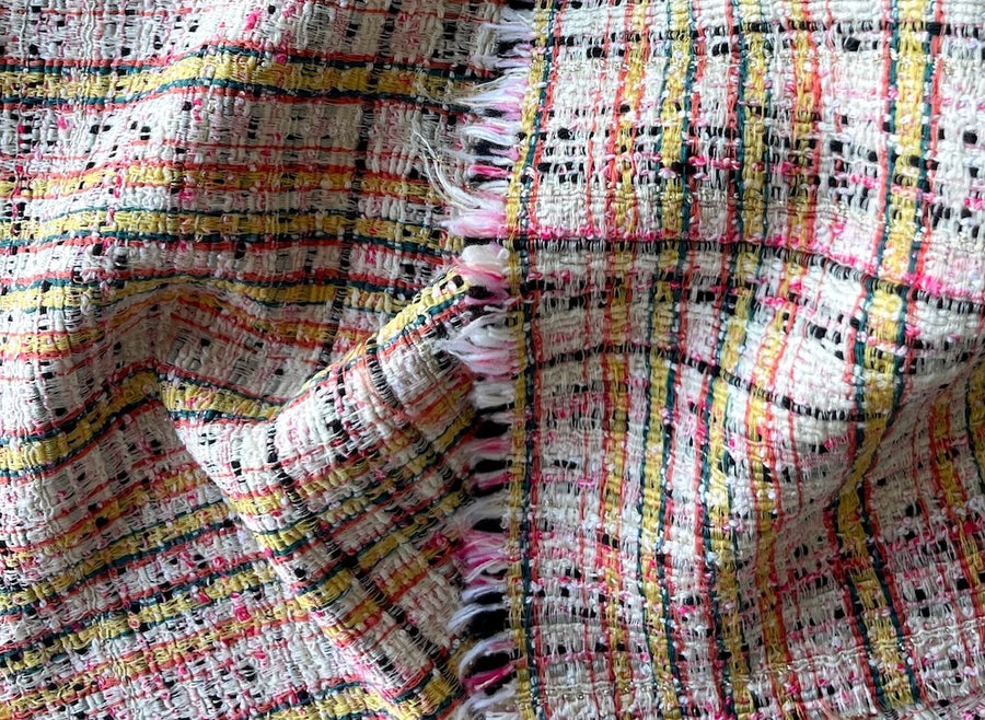 A couture mid-weight cotton blend bouclé plaid in lemon, carnation pink, and onyx, with teal, metallic gold, and tangerine accents - this singularly bubbly cotton blend bouclé is perfect for a Chanel-style jacket, a skirt, boleros, or a simple dress. Made in Italy and used by Balenciaga. 50% cotton, 30% polyester, and 20% viscose. 52" wide.