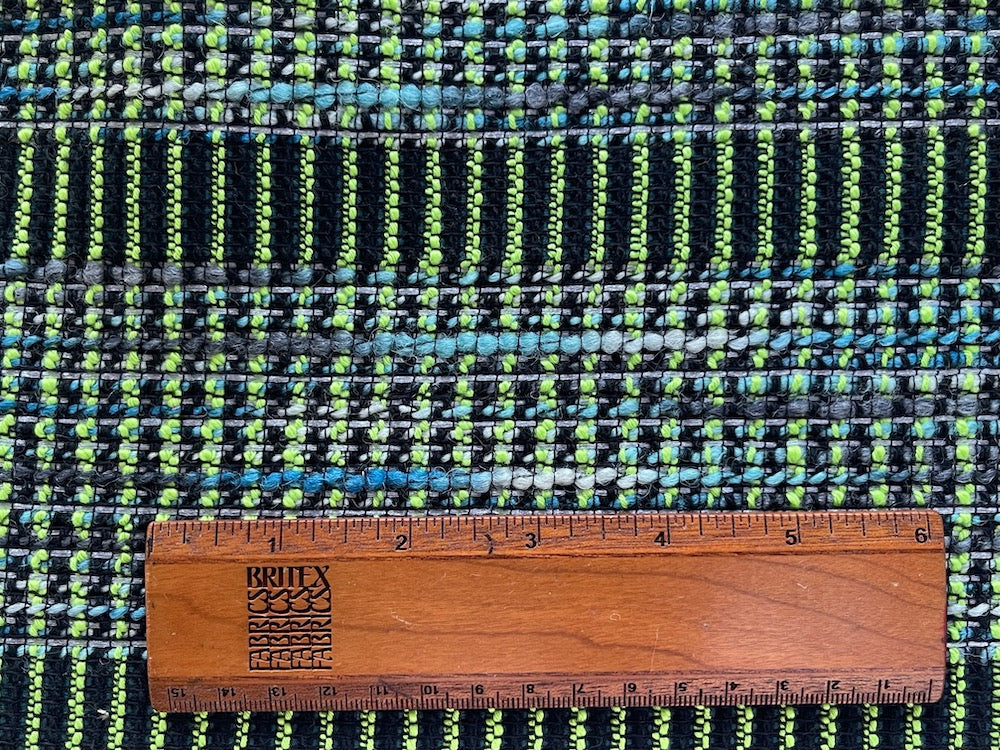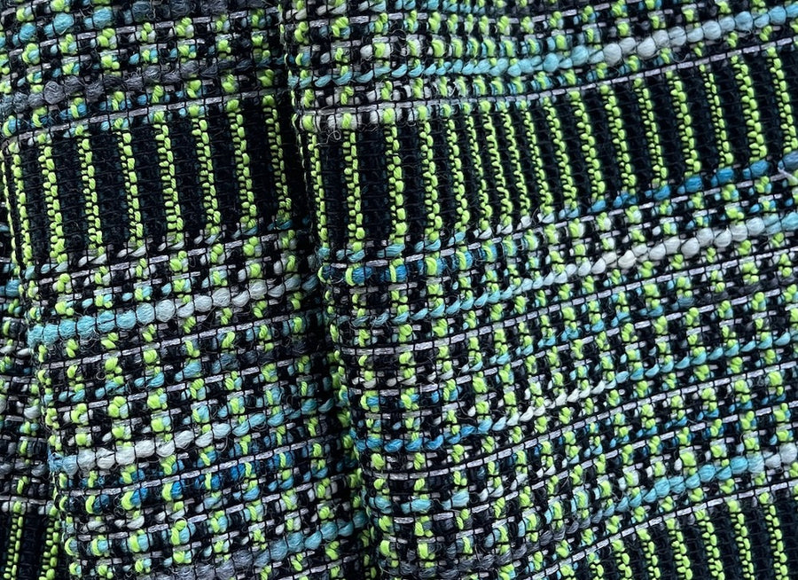 A mid-weight cotton blend bouclé suiting in fun summery shades of lime sherbet, aqua, lavender ice, and black - this striped, bold summer suiting bouclé is perfect for a cropped jacket, a long skirt, or a couture-style jacket. Made in Italy. 60% polyester, 20% cotton, and 20% nylon. 59” wide.