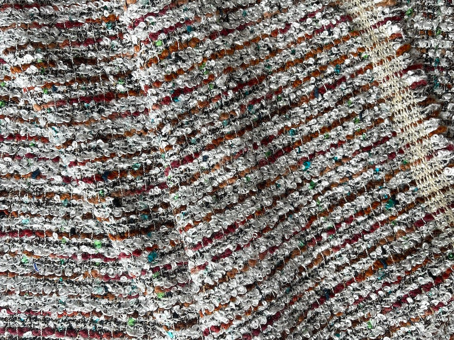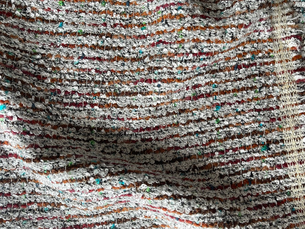 A classic bouclé in shades of warm brick, nutmeg, and white, accented with subtle flecks of turquoise and emerald - this multi-yarn bouclé is perfect for a French, couture-style jacket, light weight coat, or sheath dress. Made in Italy. Cotton, Polyester, acrylic, and nylon blend. 54" wide.