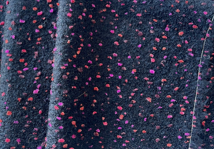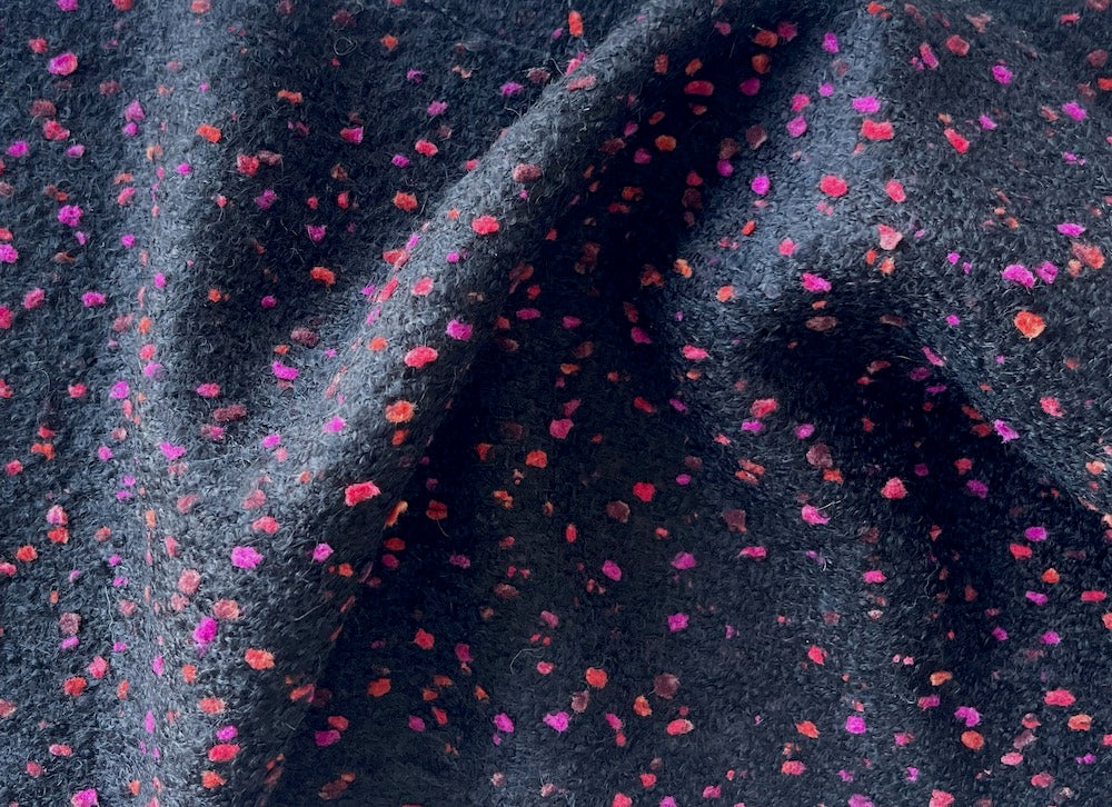 A chic wool blend bouclé in a chic jet black with brilliant persimmon and magenta flecks - this scrumptiously chunky wool bouclé is perfect for a stylish finger length coat, a fitted dress, or glamorous full pants. Made in Spain. 50% wool and 50% polyester. 58" wide.