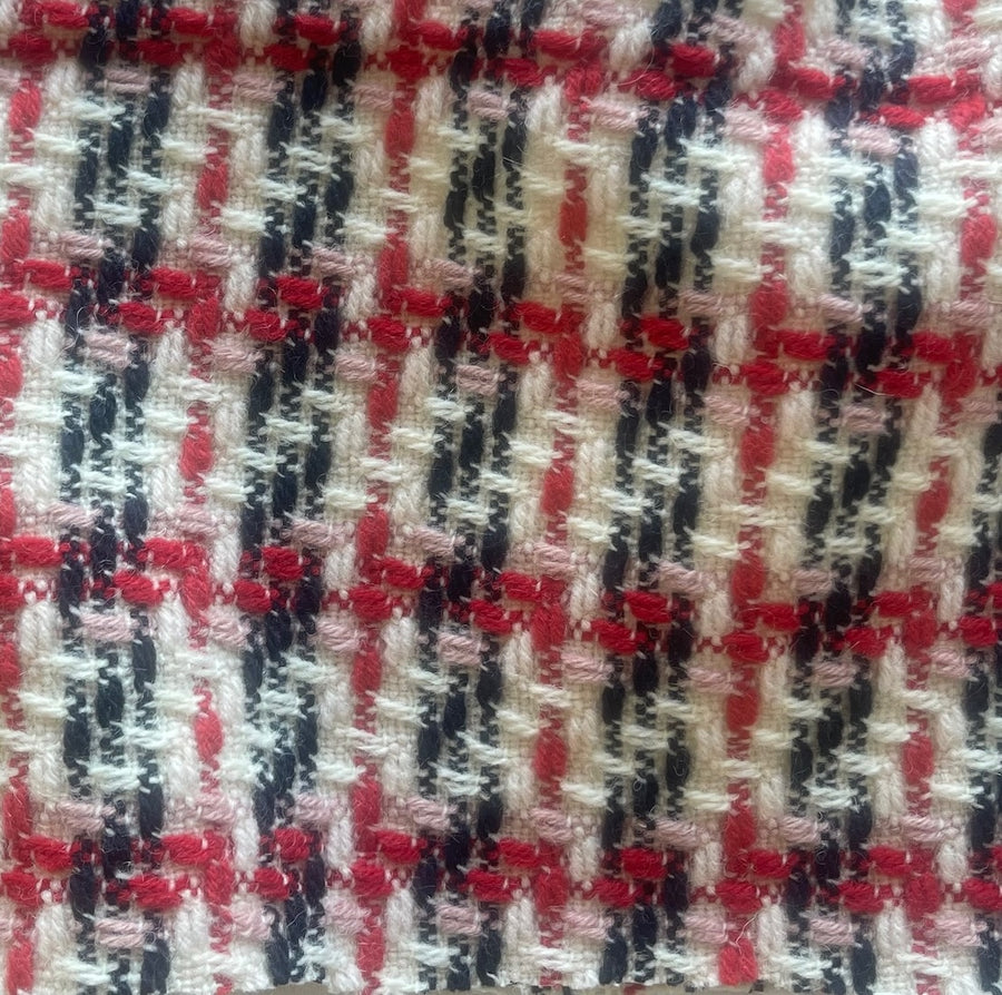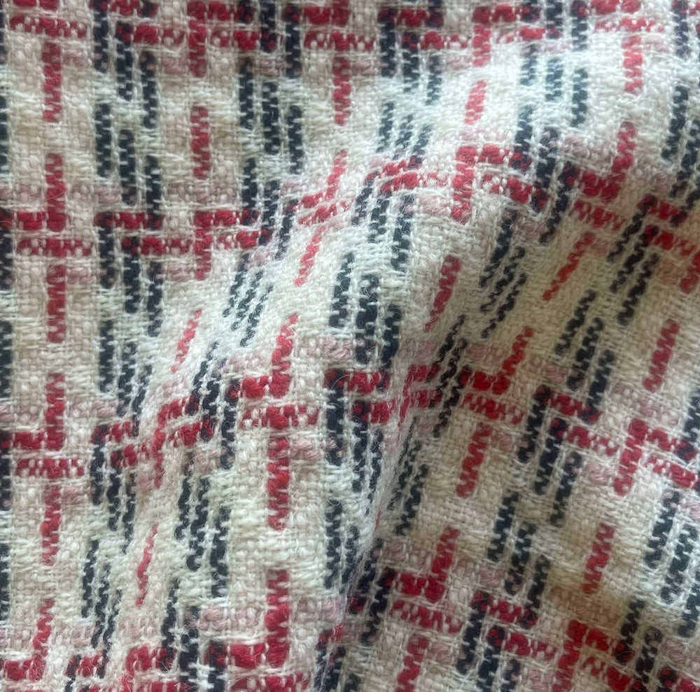 A couture mid-weight wool blend bouclé geometric design of stylized hash marks in licorice and cherry on an ivory background, and with subtle pale pink accents - this elegant bouclé is reversible, making it perfect for using the reverse side for cuffs, pockets, and other trim! Make it into a Chanel-style jacket, a skirt, a bolero, or a simple dress. Made in Italy. 60% wool, 30% acrylic, and 10% cotton. 54" wide.