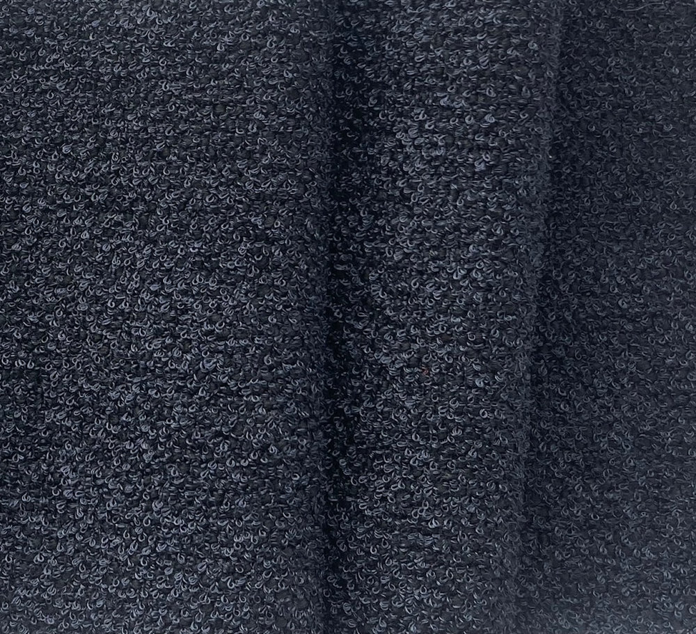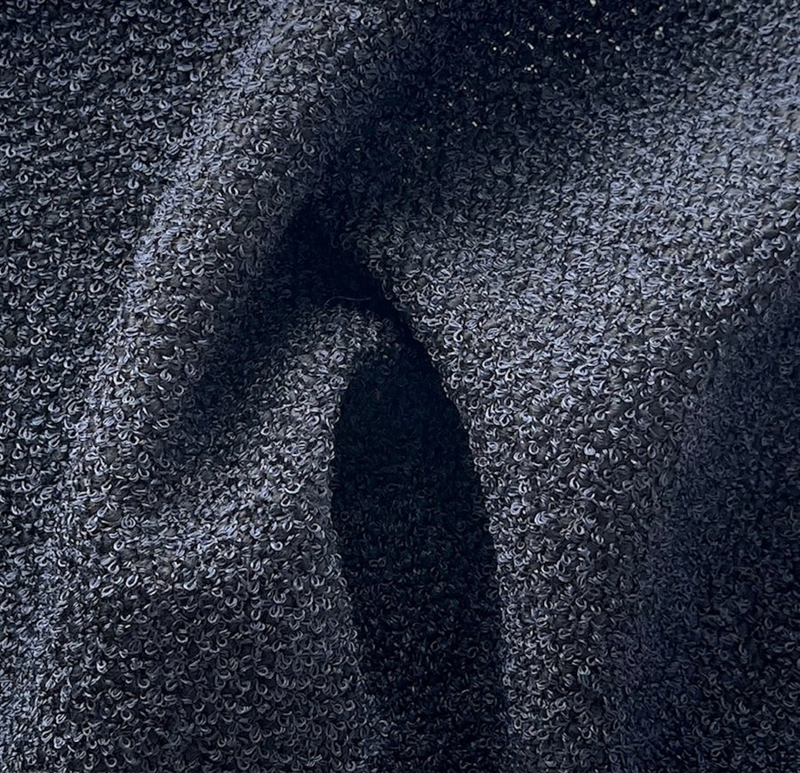 A designer mid-weight textured wool blend bouclé plaid in classic shades of midnight navy and onyx - this airy, elegant bouclé is perfect for a French couture-inspired suit, a chic coat, or a dress. Made in Italy for a well-known, couture French designer. 89% wool and 11% polyester. 60" wide.