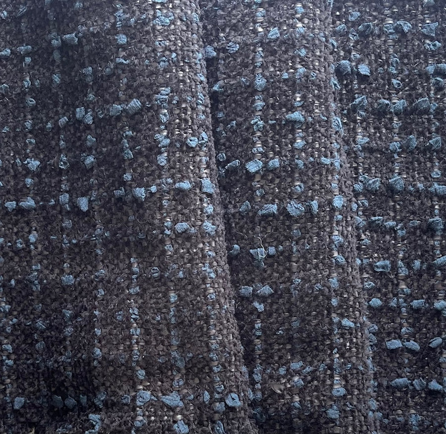 A couture, mid-weight cotton blend bouclé woven check in chic storm cloud black with midnight navy accents - this elegant, chunky bouclé is perfect for a French couture-inspired suit, a chic coat, or a dress.Made in Italy and used by a well-know French designer. 40% cotton, 40% poliamide, and 20% polyester. 58" wide.