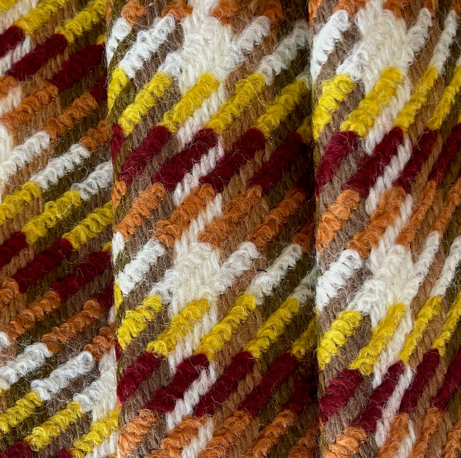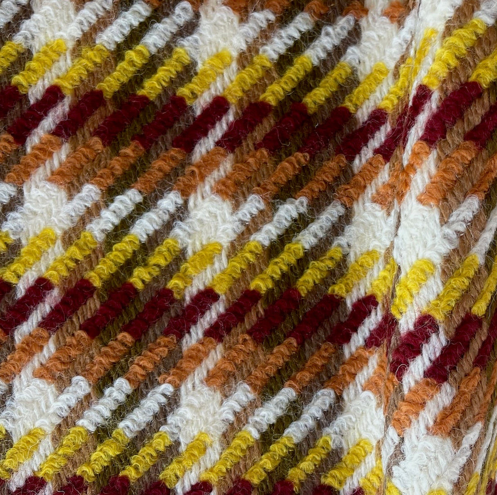 A couture, mid to heavy-weight wool blend bouclé twill in shades of autumn; burgundy, pecan, pumpkin, golden corn, and white - with a pronounced twill weave, this chunky bouclé is perfect for a coat, jacket, or even a hoodie! Made in Italy. 90% wool and 10% cotton. 58" wide.