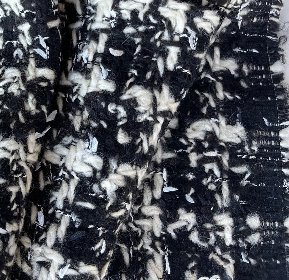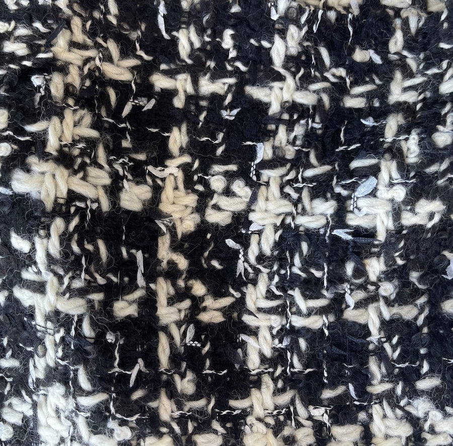 A couture, mid-weight wool blend bouclé plaid tweed in soot and vanilla - this chunky bouclé is elegantly timeless, perfect for a Chanel-style jacket, a skirt, a bolero, or a simple dress. Made in Italy for a high-end designer. 85% wool, 10% polyester, and 5% acrylic. 58" wide.